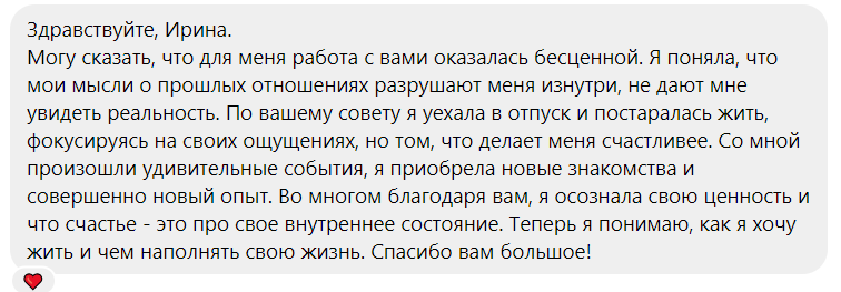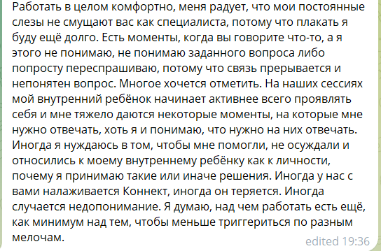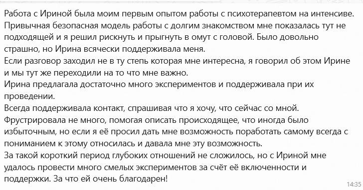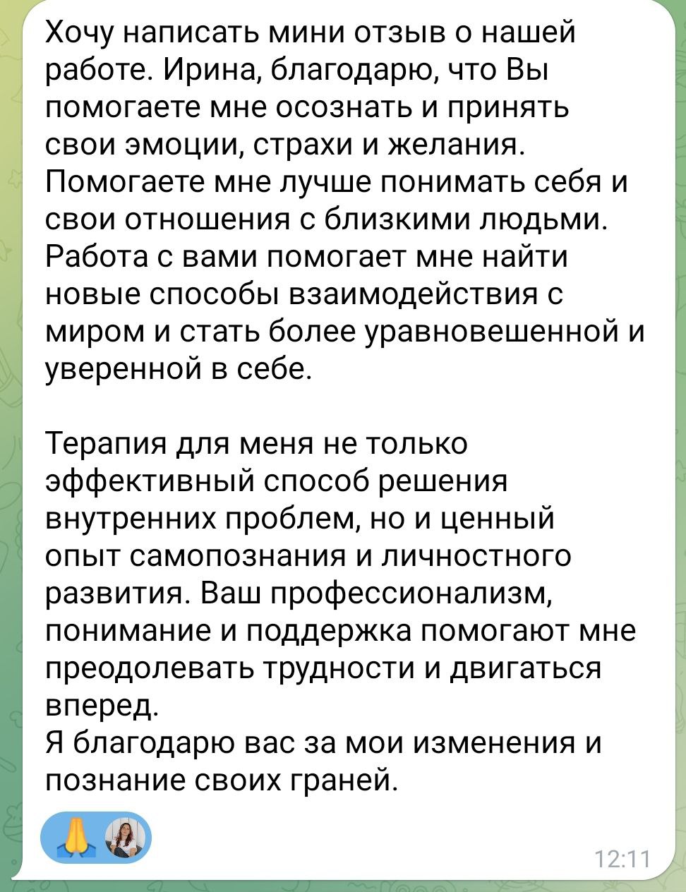 Работаю как в формате консультаций – несколько встреч, так и в длительной терапии от года.